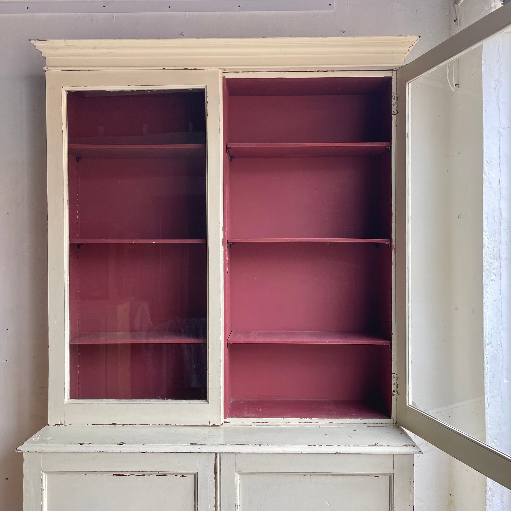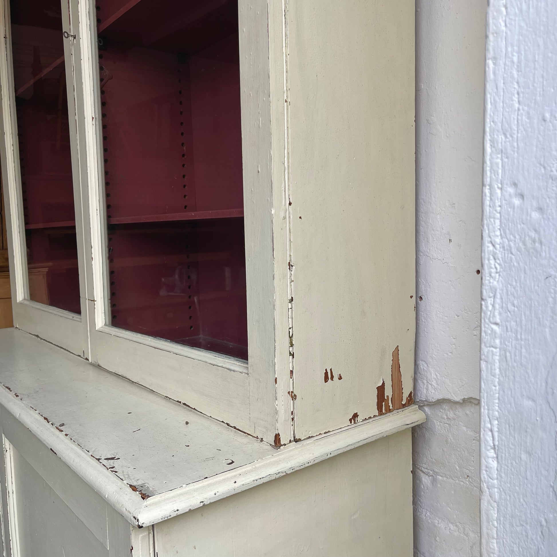 Pitch pine painted cupboard. Painted by a previous owner & looking very 'chippy'. The cupboard is in good solid condition. The top is a glazed two door cupboard with internal shelves painted red, the base is a two door cupboard with one internal shelf. The back is made of mdf. Comes in three pieces to make moving easier.