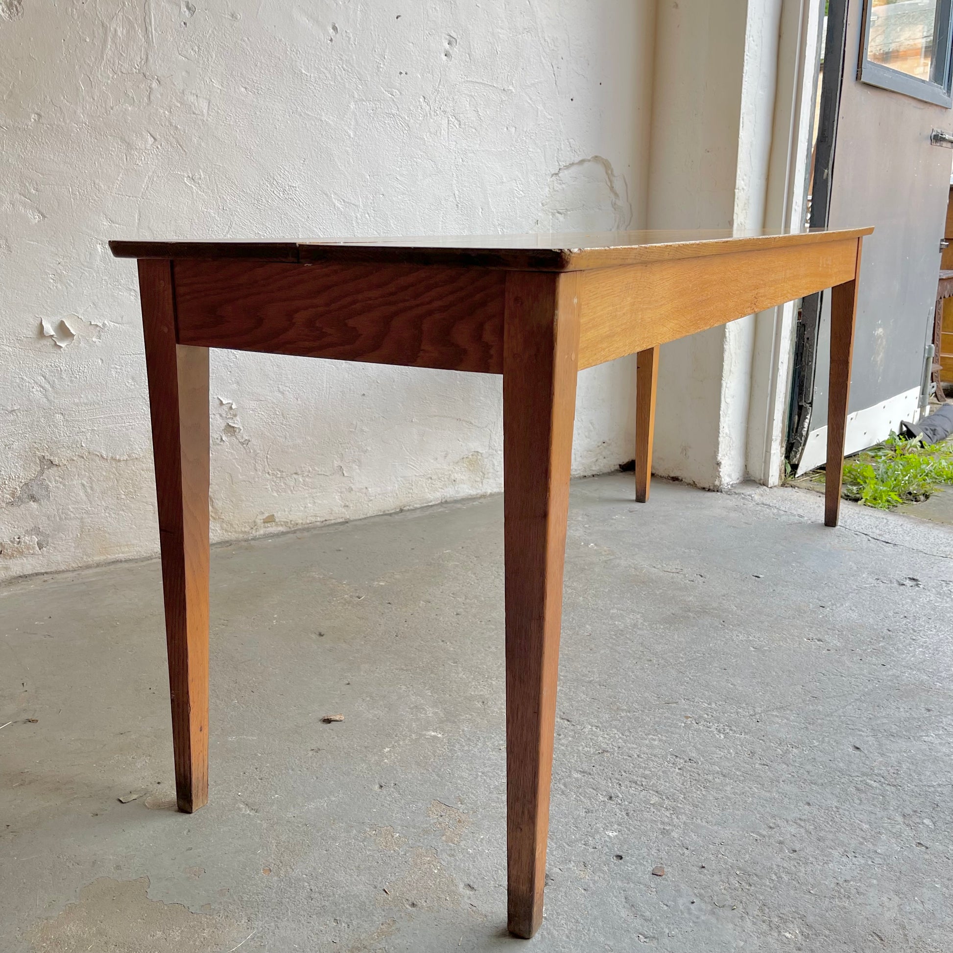 A mid-century oak table with slim tapered legs. Unrestored + in its original condition with a varnished finish. There are marks to the top + graffiti on the sides due to past use as seen in the photos. In good solid condition. Would make a great dining table or console.